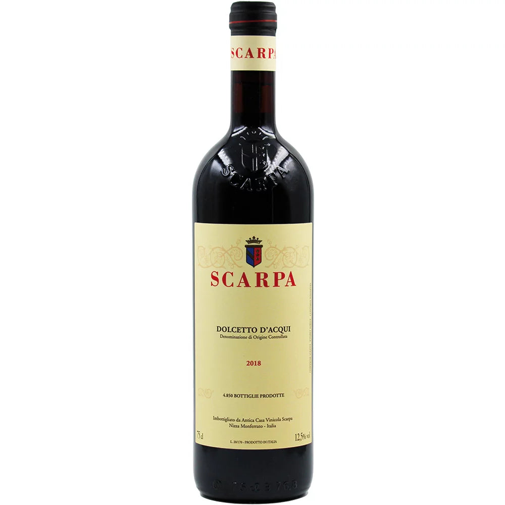 Il Dolcetto d’Acqui DOC 2018 della cantina Scarpa nasce nelle colline piemontesi attorno ad Acqui Terme, territorio da sempre vocato alla produzione di vini autentici e identitari. La storica cantina Scarpa, fondata a metà del XIX secolo, è celebre per la sua attenzione alla tradizione e alla longevità dei suoi vini, interpretando il Dolcetto con uno stile sobrio ed elegante.